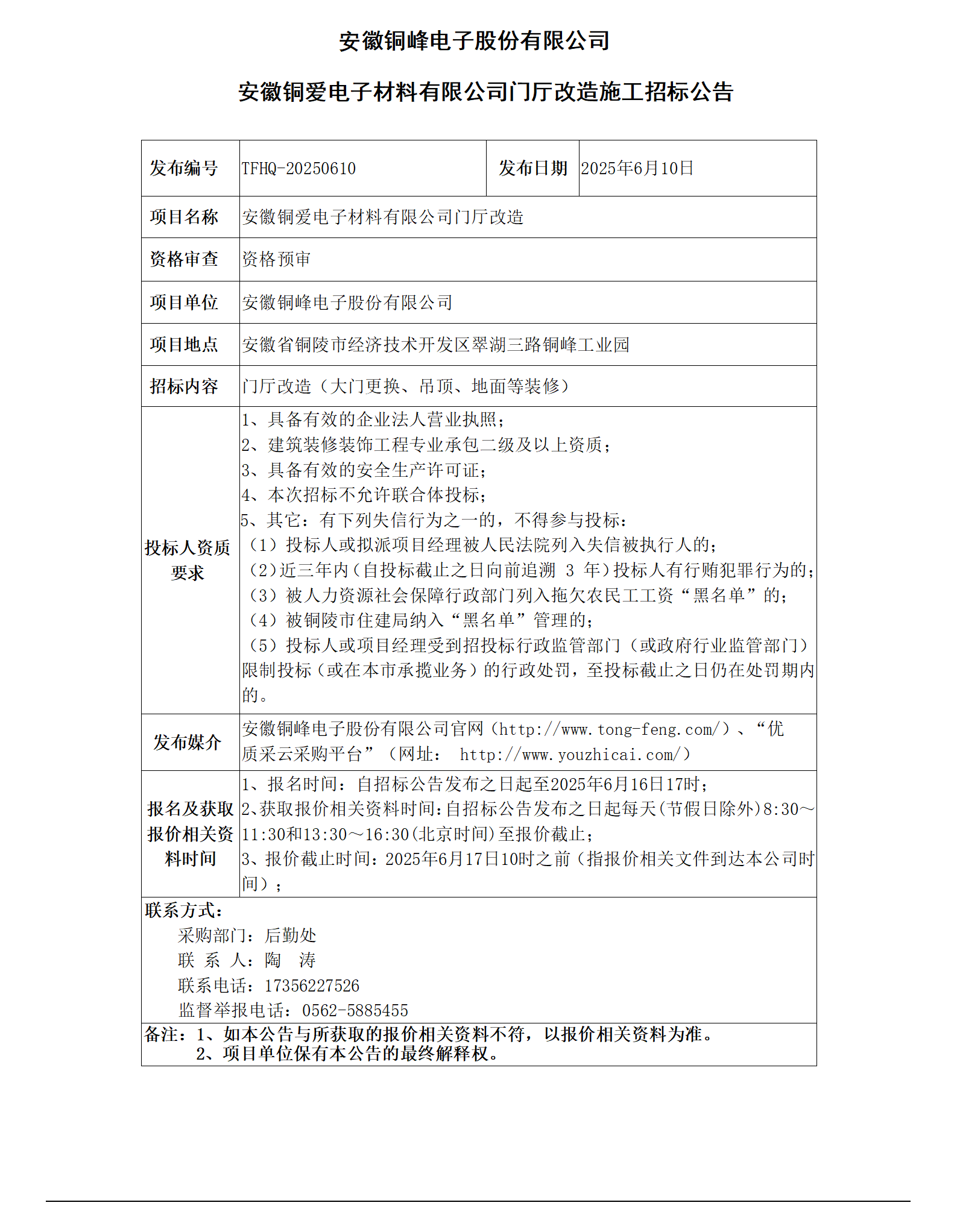 安徽銅峰電子股份有限公司 (銅愛(ài)電子公司門(mén)廳改造招標(biāo)公告)_01