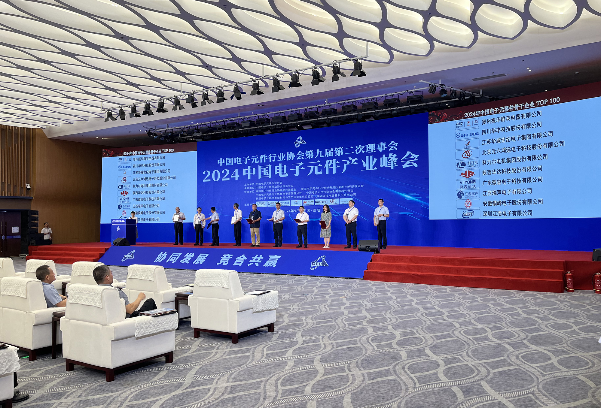 會議過程中,除舉辦主題演講、高端對話、分會平行論壇外,還舉行了2024年中國電子元器件行業(yè)骨干企業(yè)授牌儀式,公司再次獲評“中國電子元器件骨干行業(yè)TOP100 ”榮譽(yù),這是公司連續(xù)三十余屆入選行業(yè)百強(qiáng)。