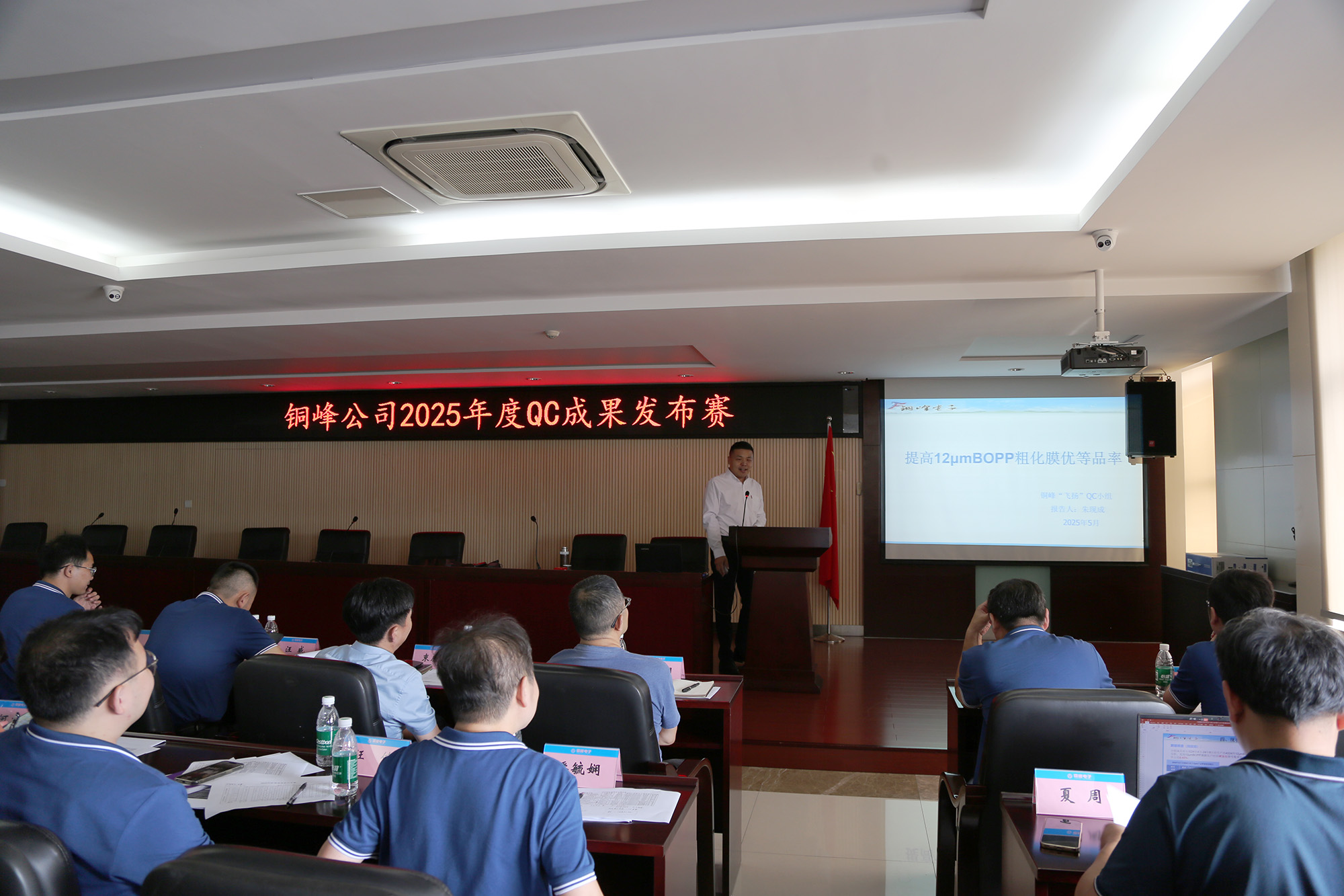 為確保評審的專業(yè)性與公平性,本次發(fā)布會由公司技術(shù)質(zhì)量專家組成專業(yè)評審團。評委們從項目選題的針對性、問題分析的科學性、改進措施的有效性、成果效益的顯著性以及現(xiàn)場發(fā)布表現(xiàn)等多個維度對各項目進行了嚴格、綜合的評分,并逐一給予了細致點評。評審既充分肯定了各小組的努力付出與突出貢獻,也針對性地提出了極具建設(shè)性的改進建議。經(jīng)評委獨立打分,薄膜分公司《提高12μmBOPP粗化膜優(yōu)等品率》項目成果榮獲一等獎,銅愛公司《提高超寬膜分切優(yōu)等品率》項目成果榮獲二等獎,配件分公司《提高橢圓型鋁殼合格率》、電容器分公司《提高引線壓接端子合格率》、鍍膜分公司《消除金屬化膜卷邊現(xiàn)象》等三個項目成果榮獲三等獎。